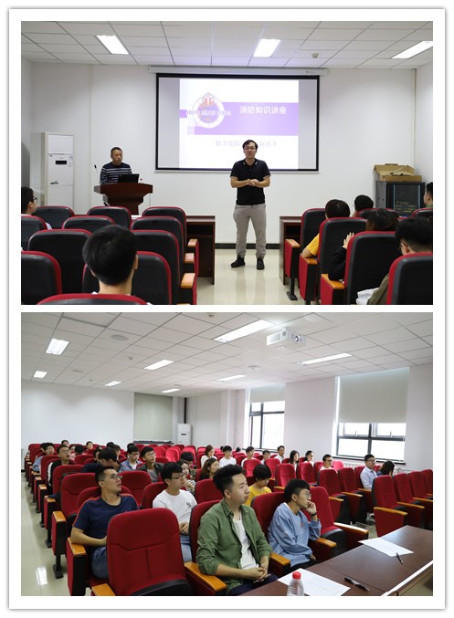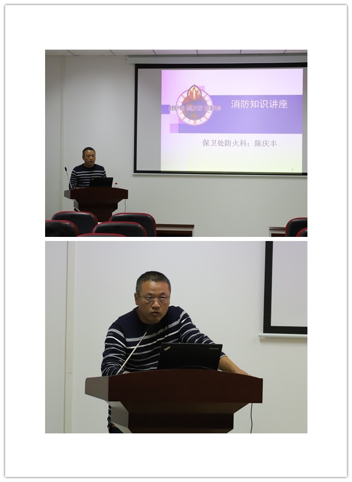 保卫处防火安全科科长陈庆丰老师首先为学生进行了校园消防安全的培训讲座,就校园生活中常见的安全隐患、处理原则及应对措施对大家进行了详细的讲解。