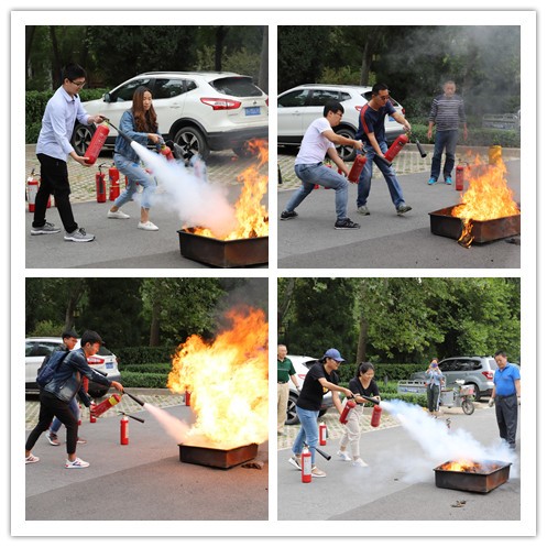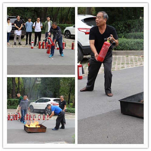 培训讲座结束后,保卫处的几位老师为学生们准备了灭火器和火盆。陈科长详细演示了不同种类灭火器的使用方法,并示范了动作要领。